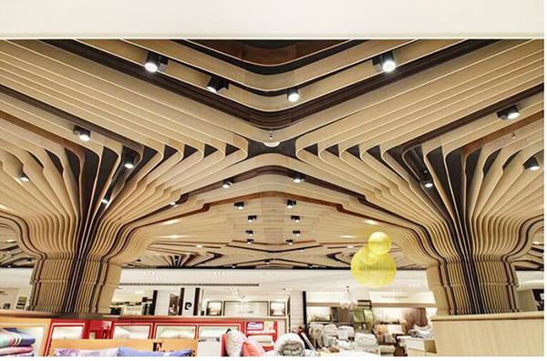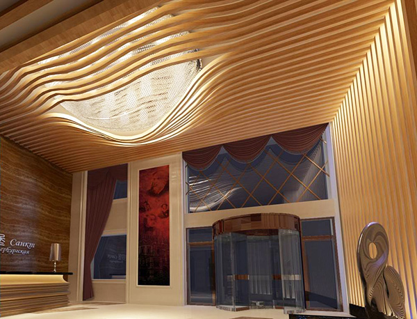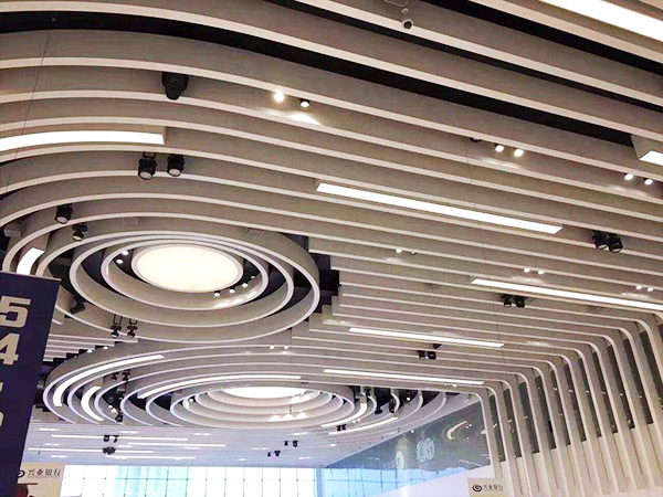 弧形鋁方通吊頂?shù)脑O計,有基本的兩點要求,一個是底寬的要求,另一個是厚度的基本要求。兩者都是因為加工工藝的限制從而受到限制,波浪造型鋁方通吊頂?shù)牡讓?,一般建議在30mm以上,小30mm,因為波浪造型鋁方通吊頂,是通過電焊固定成型的,電焊的過程中,需要保證整個鋁方通的平直度,如果底寬太小,電焊加工的過程中很容易造成歪曲,從而影響整根鋁方通的效果,其次,厚度的基本要求,是因為波浪造型鋁方通吊頂燒焊加工而成,燒焊的焊點比較多,溫度較高,如果是太薄的板子,一燒焊就穿了,這樣自然是加工不了的,因而波浪造型鋁方通吊頂厚度要求在2.0mm以上